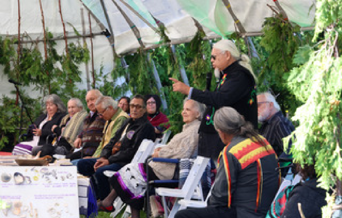 The Gathering brought together Elders and youth from the two Nations as well as honored guests such as Chief Arvol Lookinghorse (Lakota), Chief Justice Emeritus Robert Yazzie (Navajo), Cheryl Demmerts Fairbanks (Tlinglit), Gwaii Edenshaw (Haida Gwaii) Melissa Nelson (Anishinaabe/Metis/Norwegian) and Kaylena Bray (Seneca), among others. Wampum belts were shared with the participants and guests. Historians Rick Hill (Tuscarora), Brian Charles (Chippewas of Georgina Island) and Alan Corbiere (M’Chigeeng First Nation) shared the significance of the belts as living history, their diplomatic role of creating covenants of peace, trade, land use, and friendship among Nations.